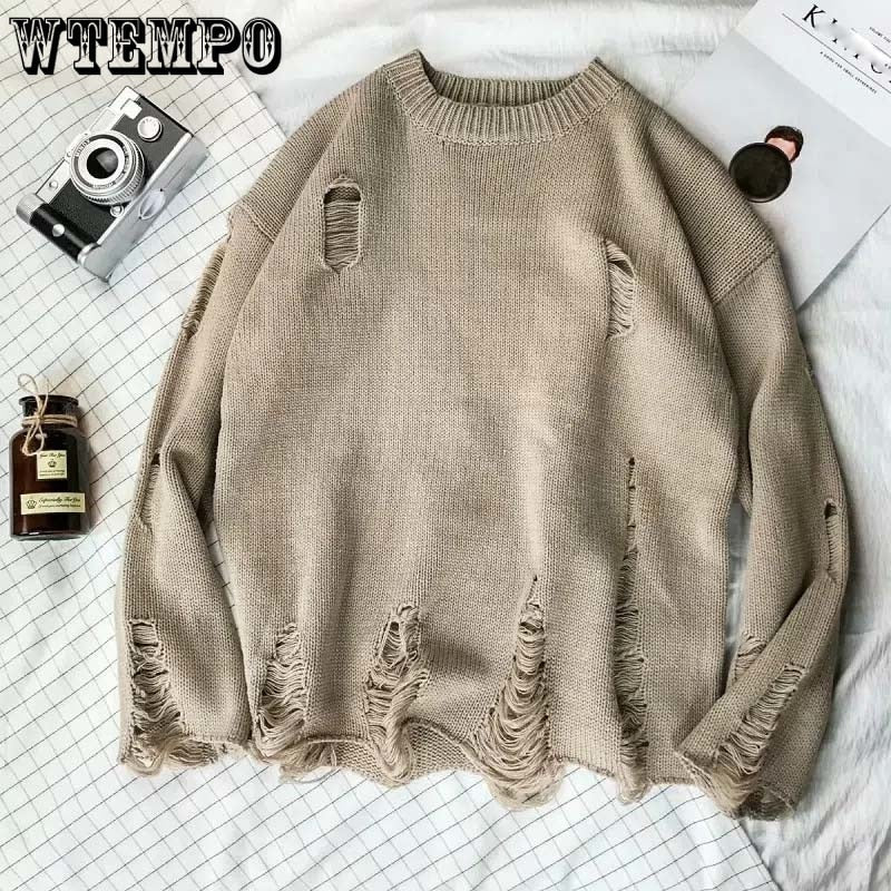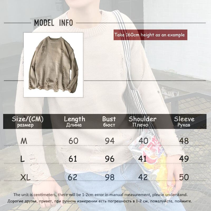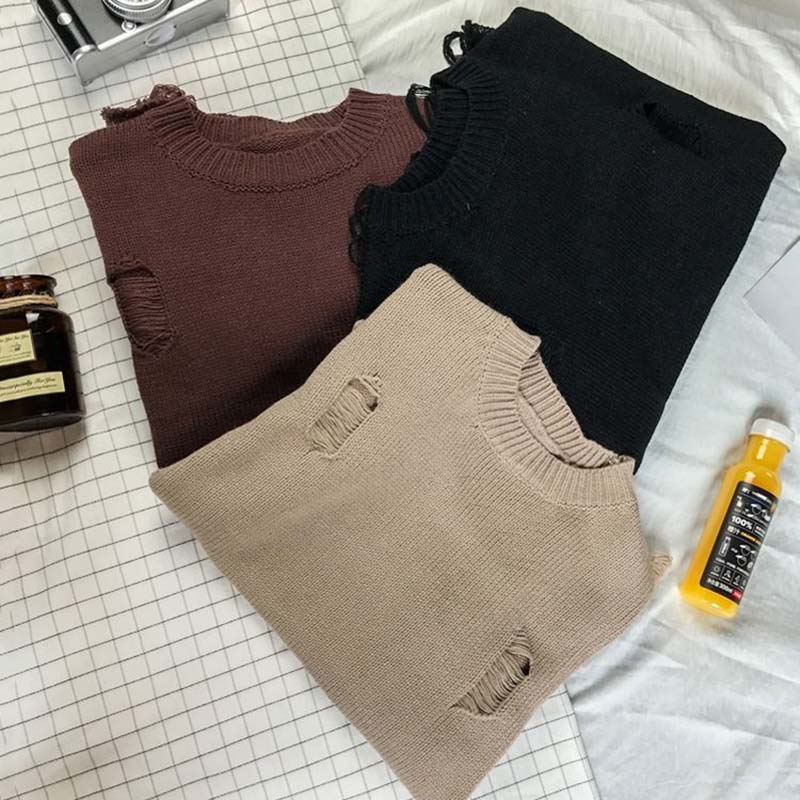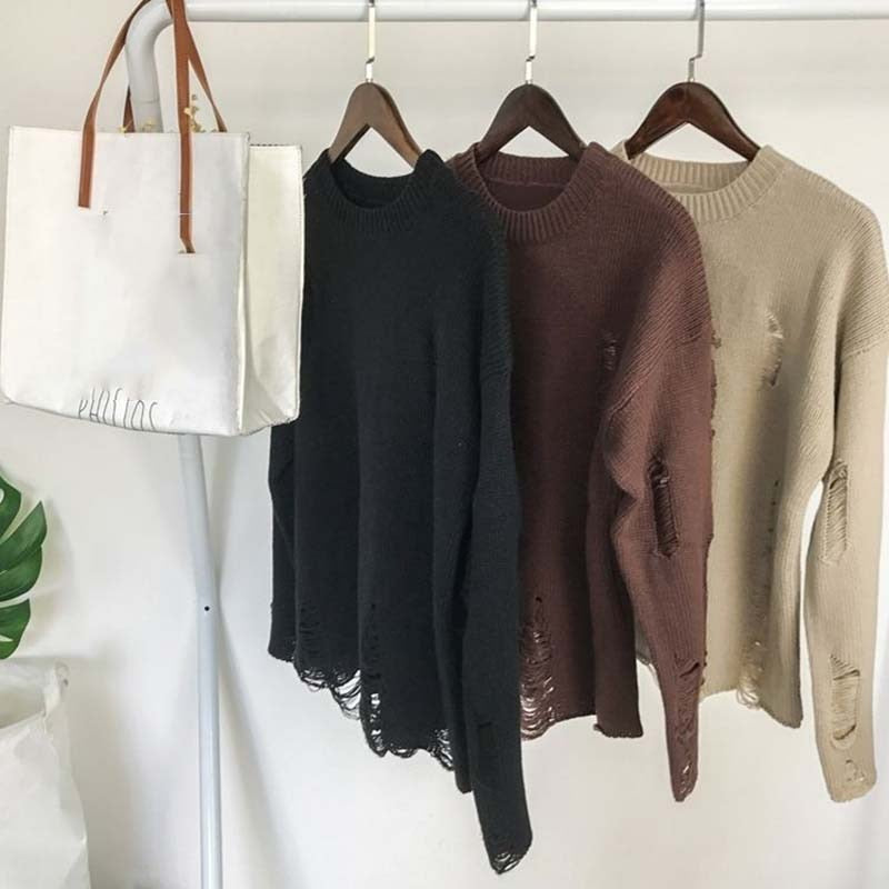 Ripped Loose Sweater Knitted Pullover Cutout Beggar Crew Neck Long Sleeves Trend Korean Style Can Be Worn By Men and Women Punk